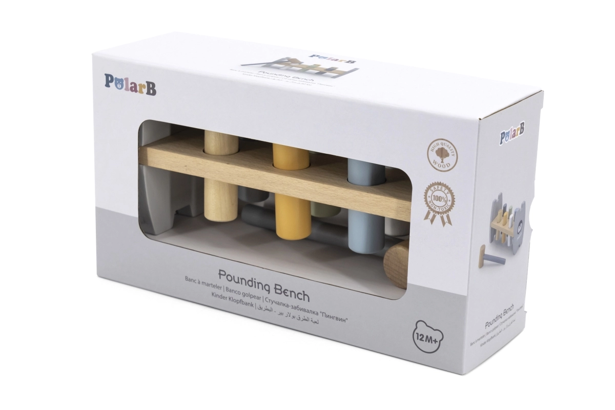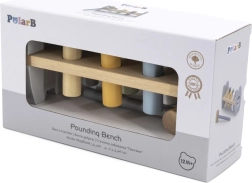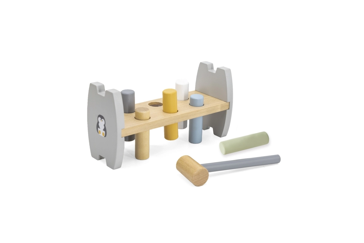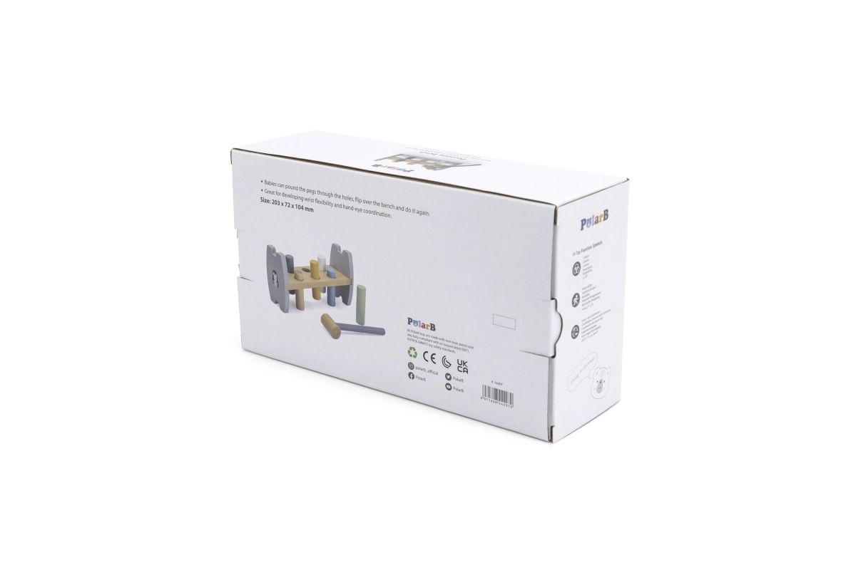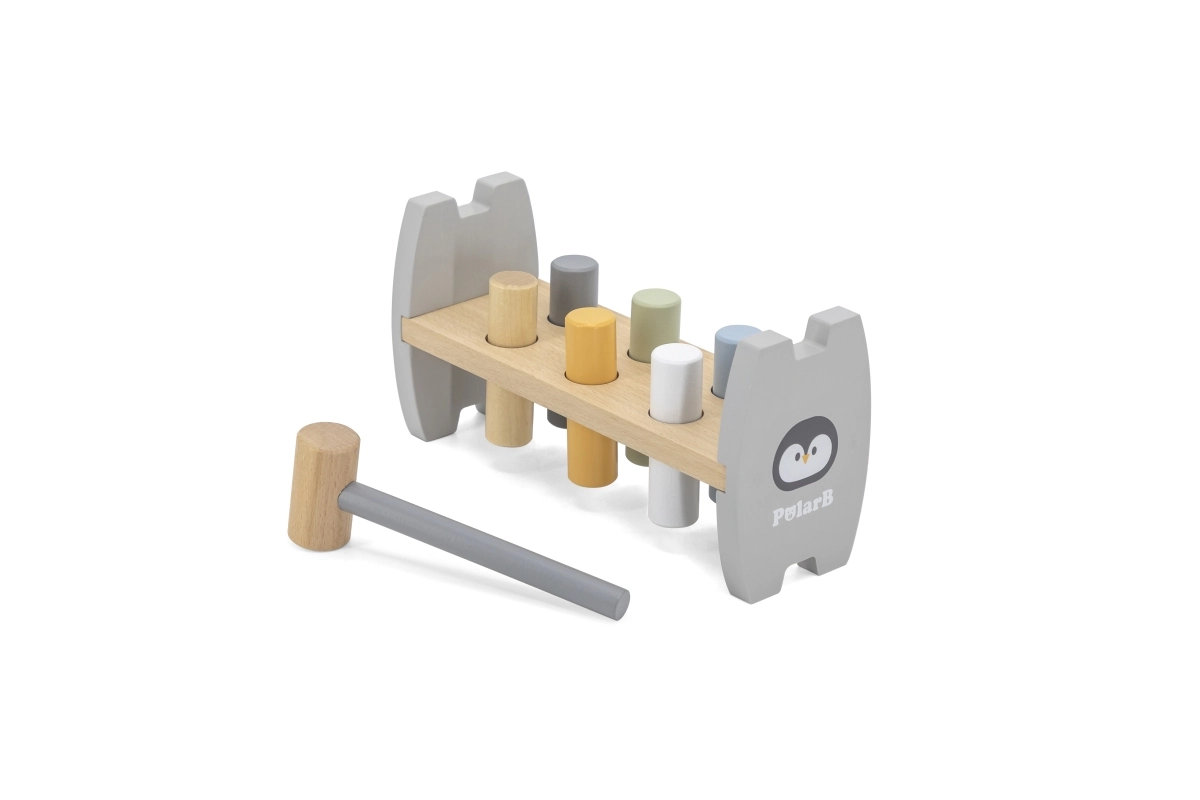Viga PolarB medinis žaislas su kaiščiais ir plaktuku Montessori idealiai tinka vaikų koordinacijai ir smulkiajai motorikai lavinti. Vaikai skatinami įkalti visus kaiščius į angas, o kaiščiai pereina į kitą rėmo pusę. Šį veiksmą galima kartoti apvertus žaislą.