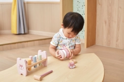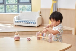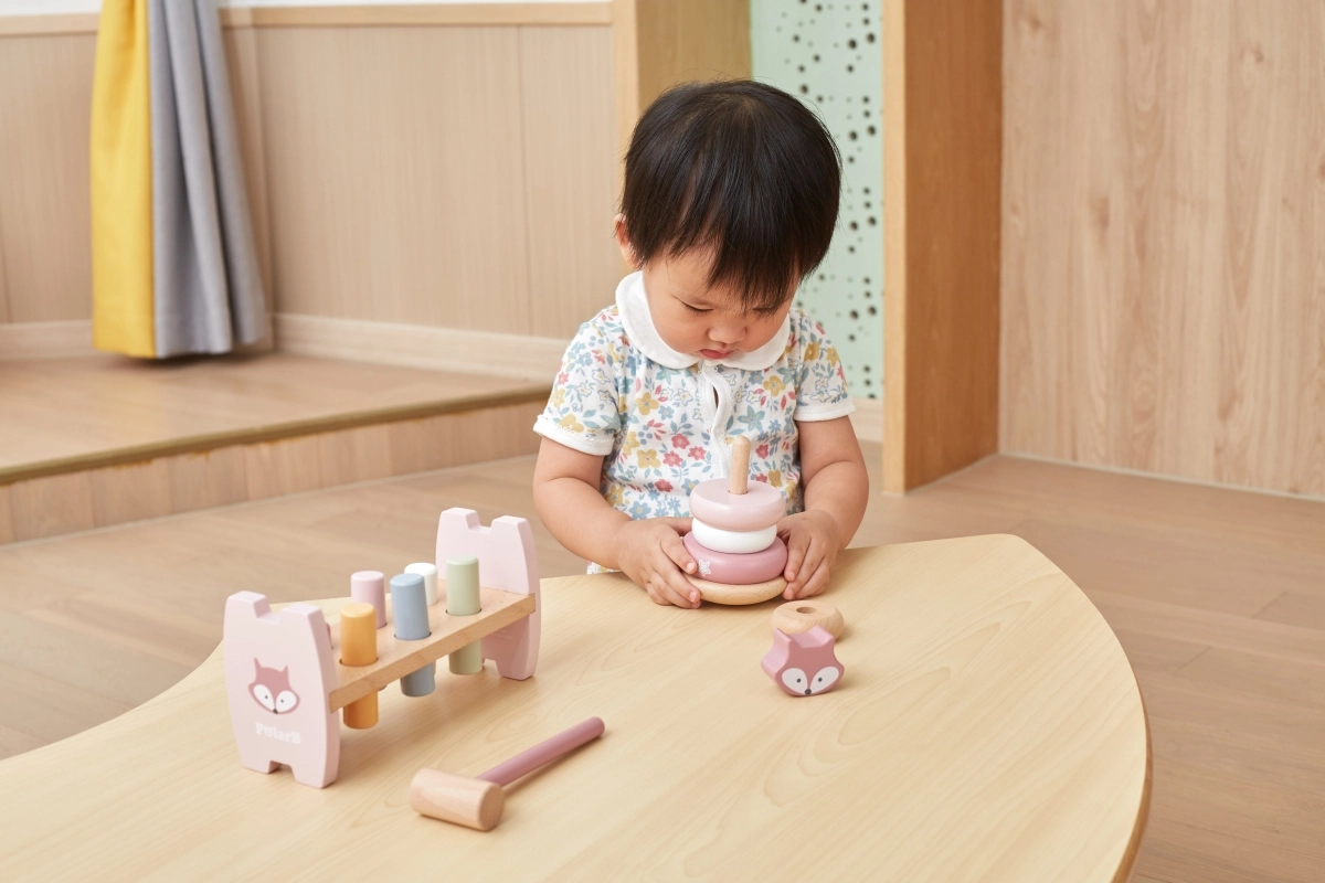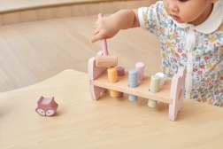 Naudodami plaktuką ir dėliodami piramidę, vaikai gerina savo motorinius įgūdžius.