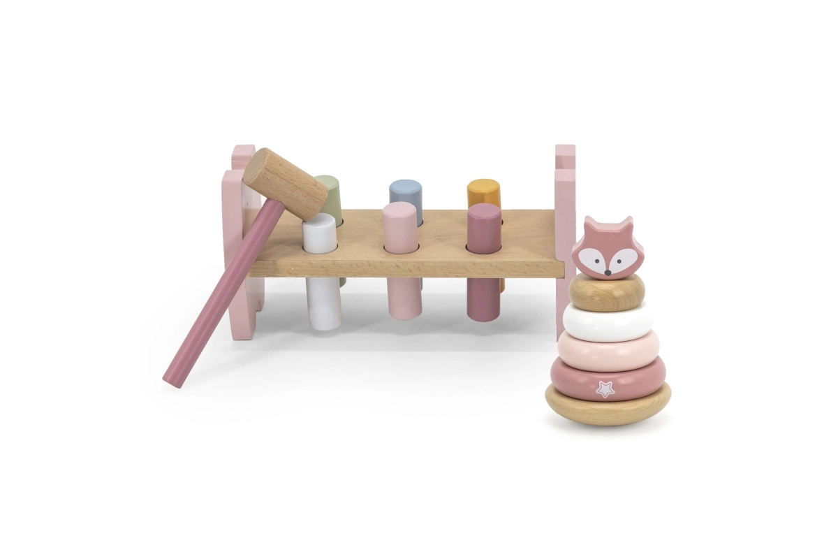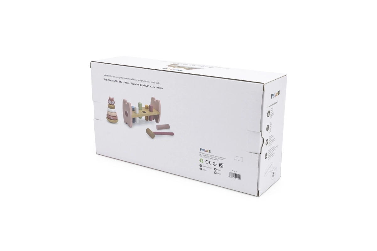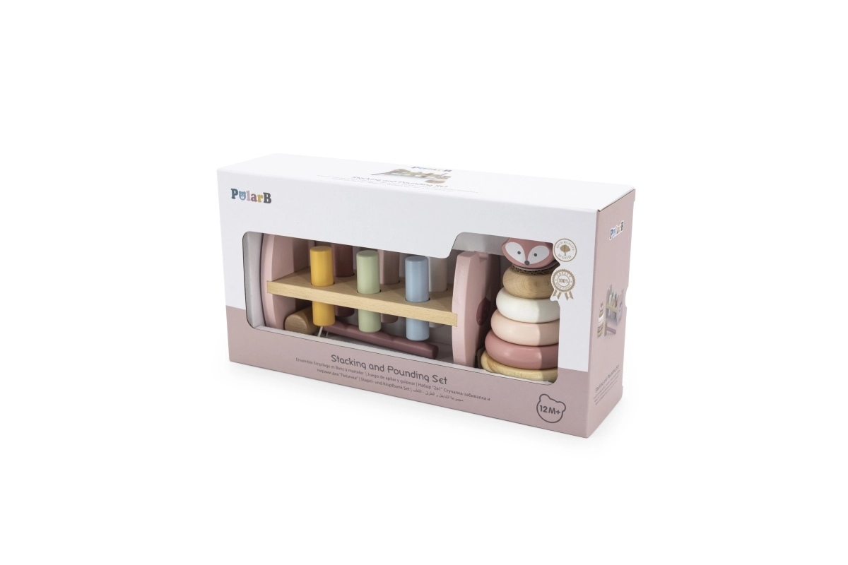 PolarB rinkinys iš prekės ženklo Viga siūlo du pastelinių spalvų medinius žaislus: edukacinę piramidę ir kalimo žaislą su plaktuku. Abu žaislai ne tik suteikia puikų smagumą, bet ir padeda lavinti smulkiąją motoriką bei loginį mąstymą.