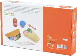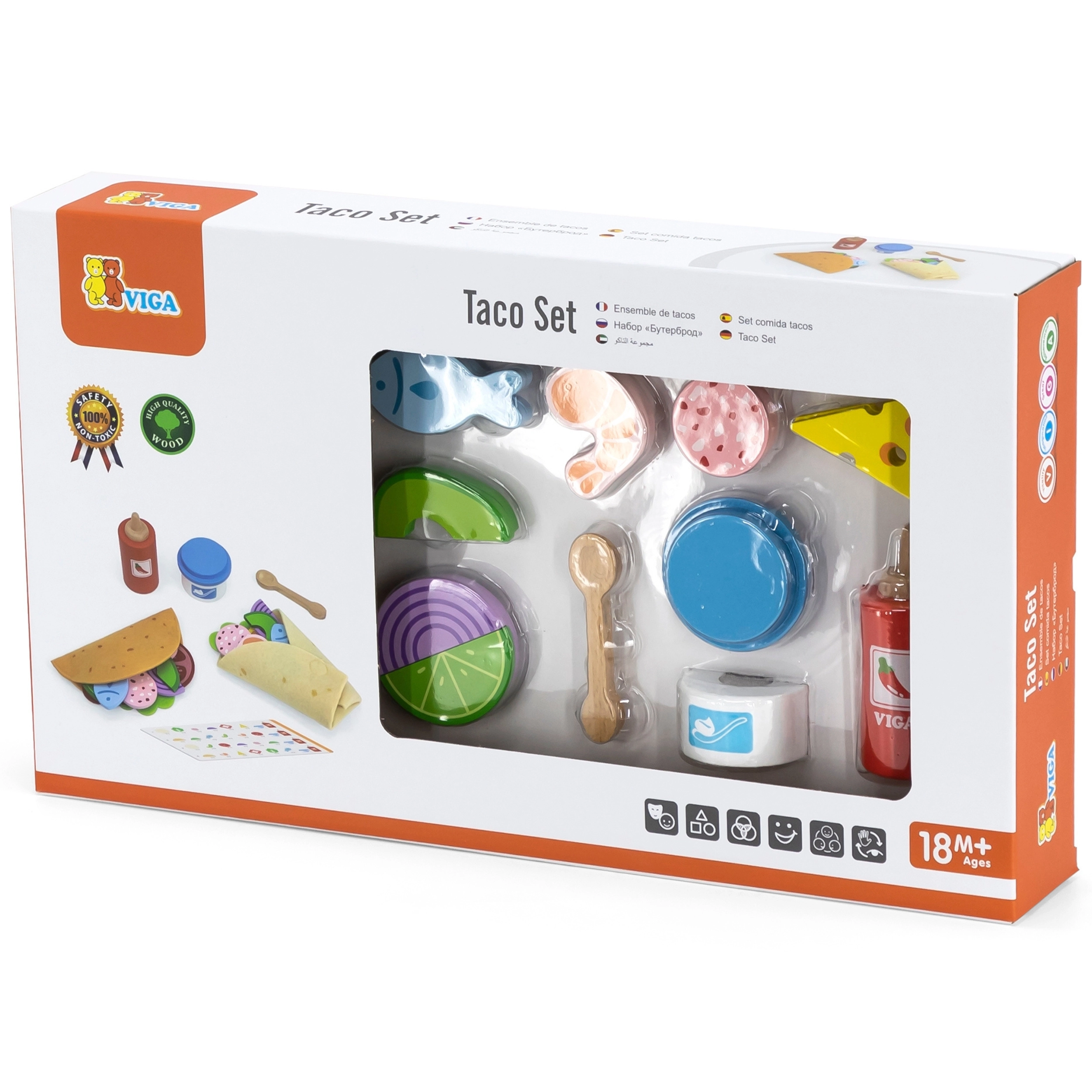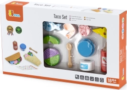 VIGA taco ir burritų rinkinys suteikia vaikams autentišką gaminimo patirtį. Minkštos veltinio tortilijos ir ryškūs mediniai maisto gabalėliai (daržovės, sūris, žuvis ir kt.) skatina derinti skonius ir kurti nuosavus receptus. Dėl priedų, tokių kaip padažo buteliukas, „jogurto“ dubenėlis ir medinis šaukštelis, žaidimas tampa dar įvairesnis.