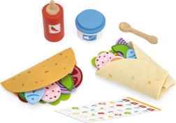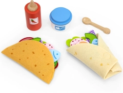 Tortilijos, padažas, „jogurtas“ ir daugiau nei dvidešimt spalvotų medinių ingredientų (pvz., avokadas, svogūnas, sūris ar žuvis) leidžia vaikams kaskart sukurti vis kitokius taco ir burritus.