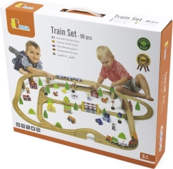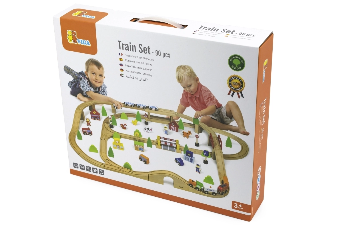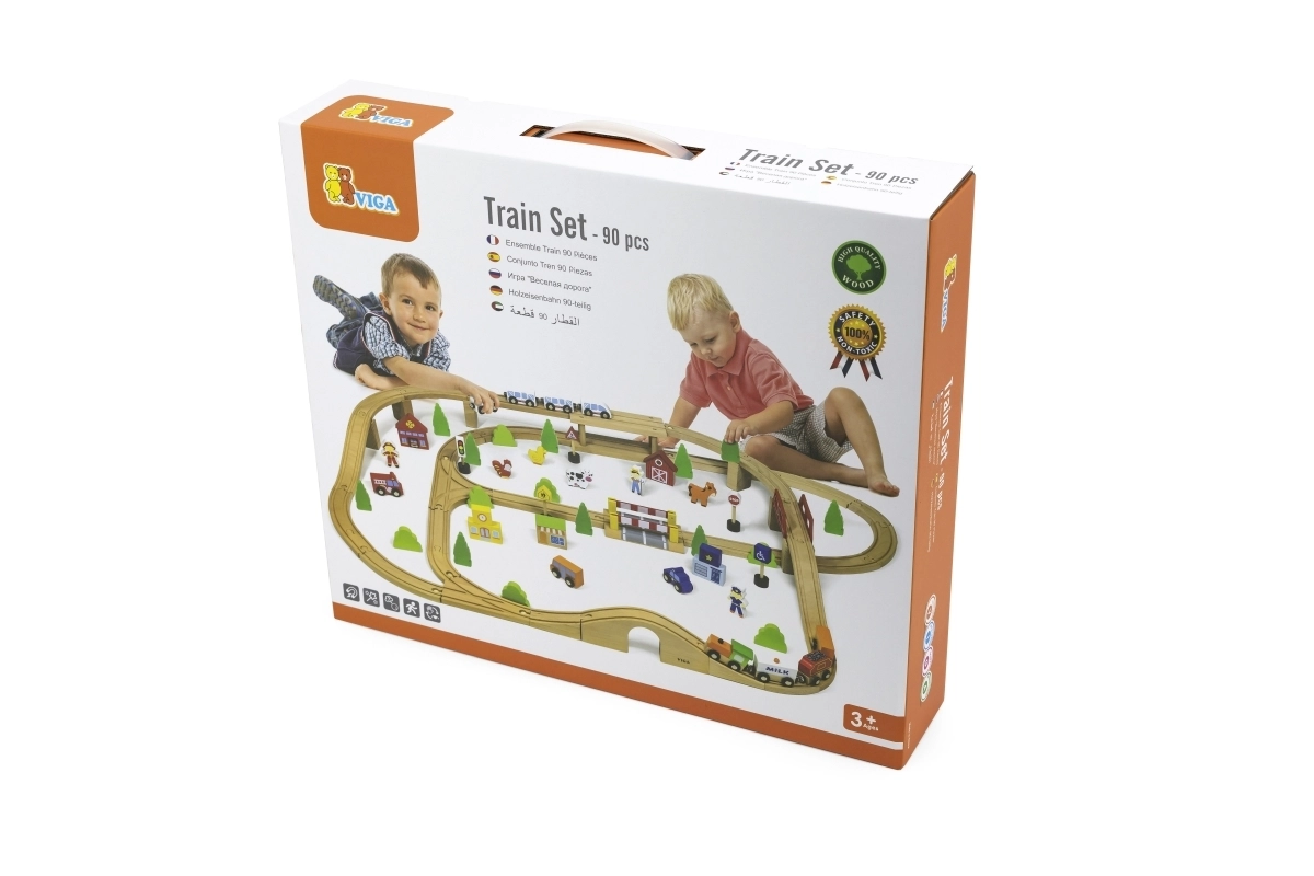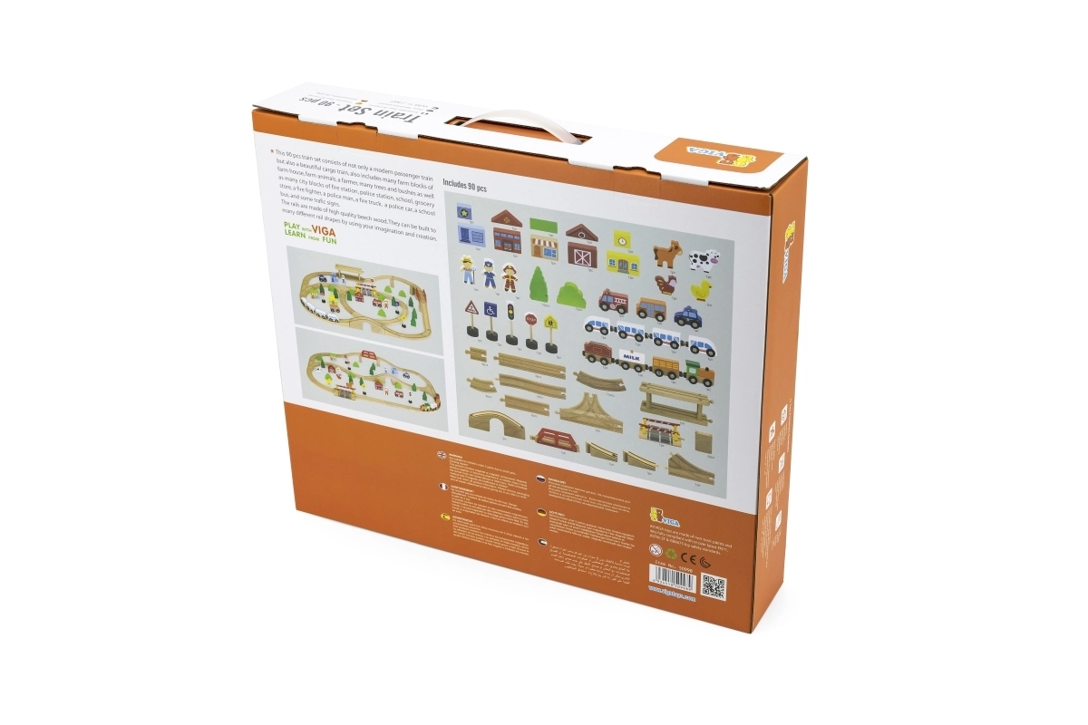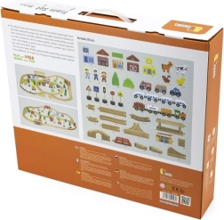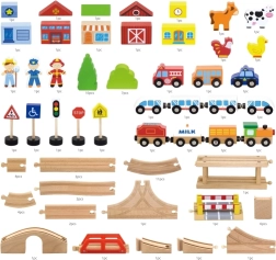 Ši išsami medinė traukinių trasa suteikia vaikams viską, ko reikia susikurti savo mažą pasaulį. Su 90 dalių mažieji statytojai gali derinti įvairių formų bėgius, tiltus ir sankryžas, pridėti transporto priemones, figūrėles ir gamtos elementus. Natūrali mediena kartu su ryškiomis spalvomis kuria laikui nepavaldų įspūdį ir skatina pojūčių suvokimą.