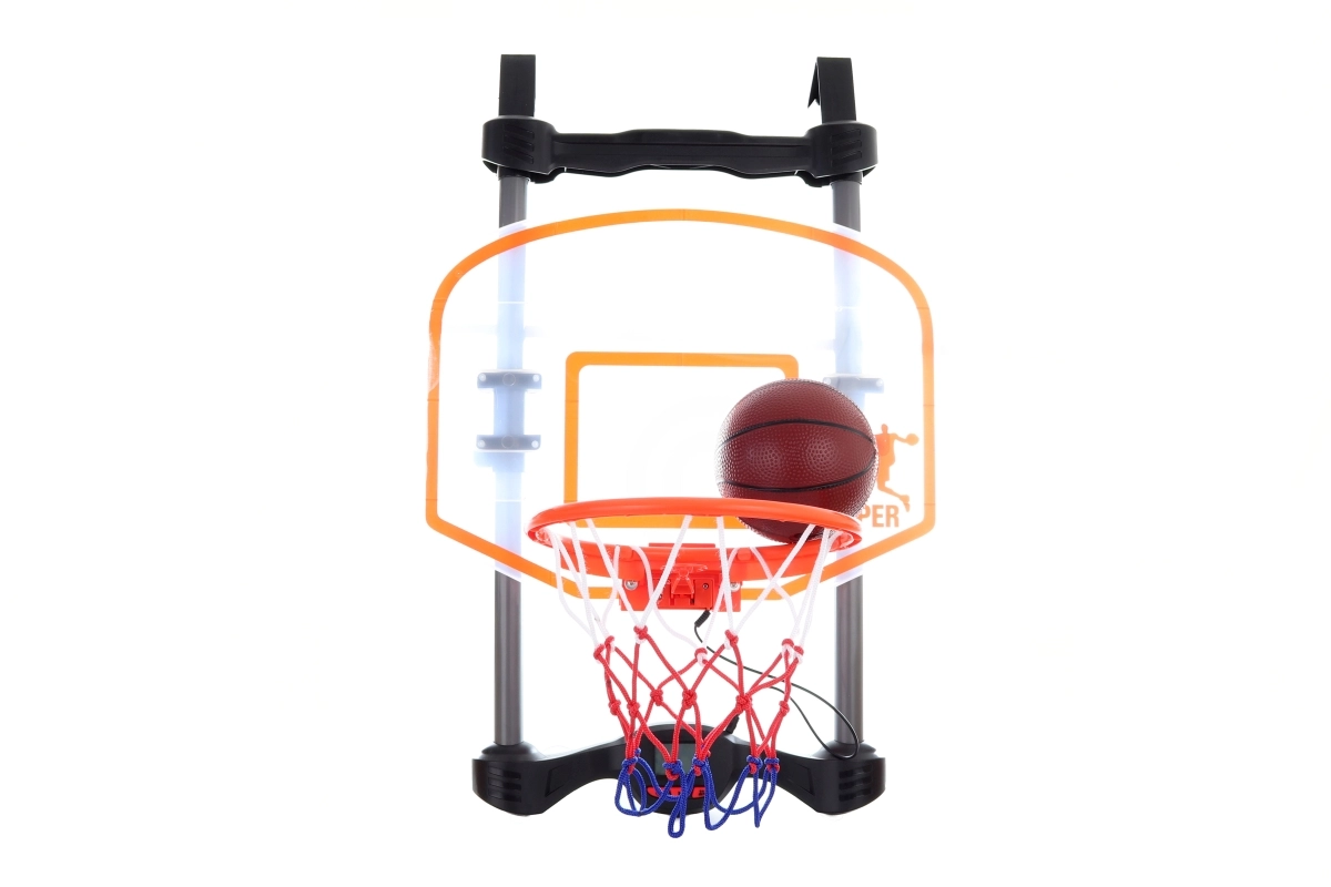 Linksmas krepšinio krepšys ant durų su elektroniniu taškų skaitikliu, garsais ir melodijomis, idealus 1–2 žaidėjams. Komplekte yra kamuolys ir pompa, montavimas greitas ir paprastas. Maitinimas 3× AAA (nepridedama).