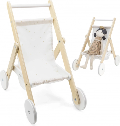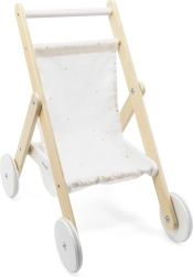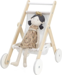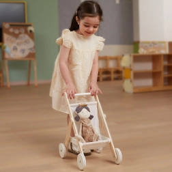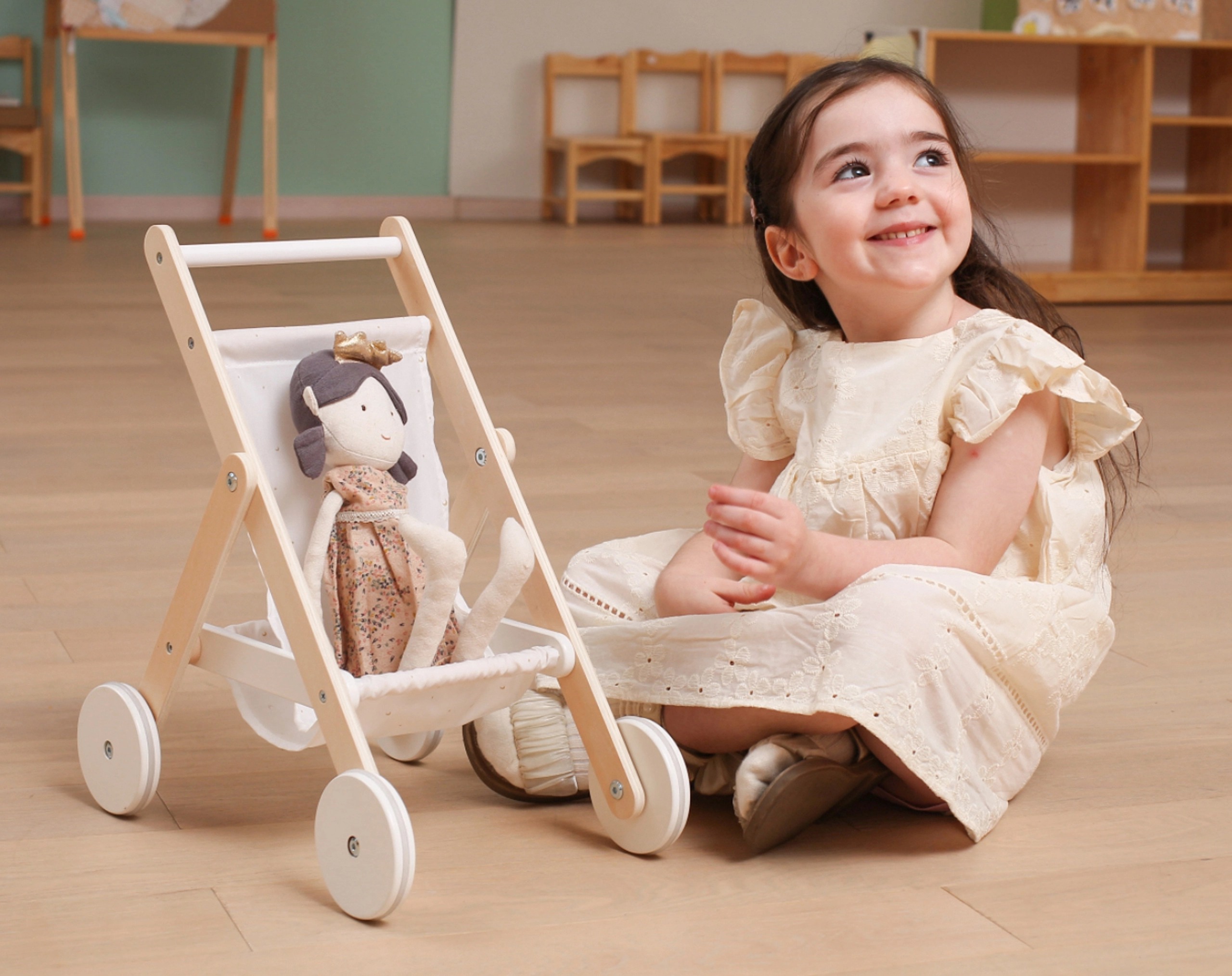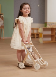 Suteikite vaikams tikrovišką tėvų vaidmenų žaidimą su elegantišku mediniu lėlių vežimėliu. Jis dera nesenstančiam dizainui, kokybiškoms medžiagoms ir saugiam apdirbimui, kad kiekviena „išvyka“ su lėle būtų patogi ir tyli. Guminiai ratų protektoriai mažina grindų triukšmą ir gerina stabilumą pirmiesiems žingsniams.
