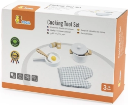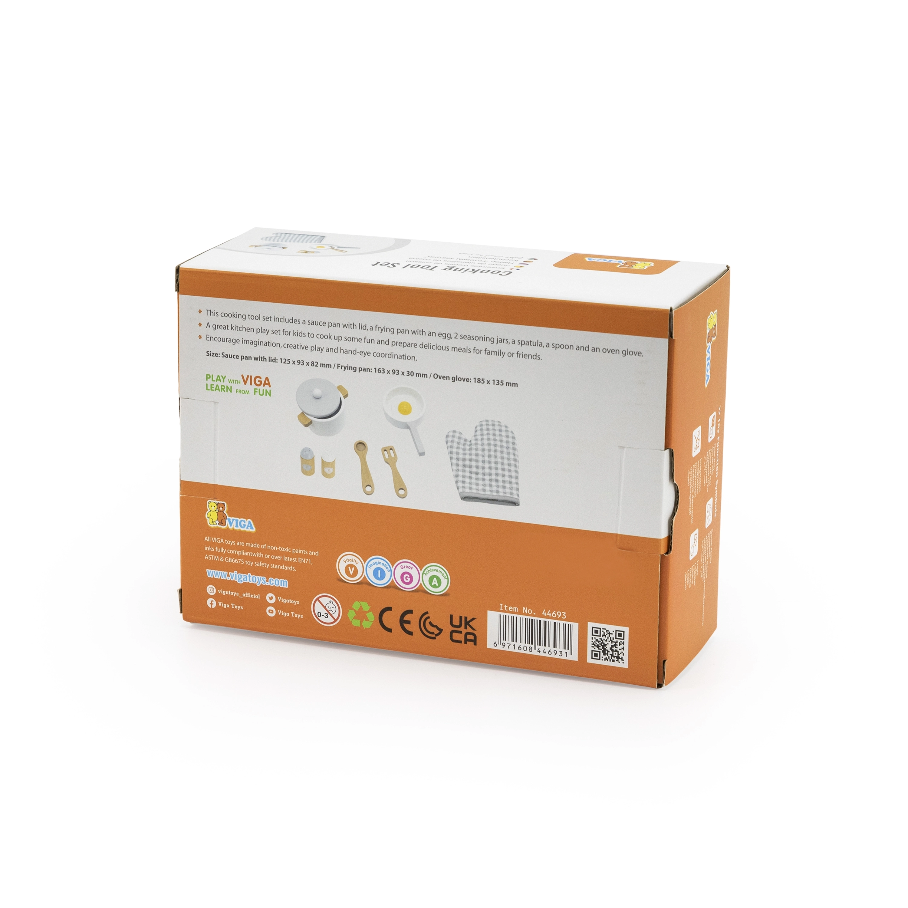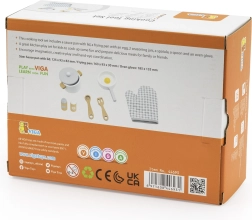 Stilingas medinis virtuvės rinkinys iš VIGA idealiai tinka vaidybiniams virtuvės žaidimams ir lavina vaizduotę, kūrybiškumą bei smulkiąją motoriką. Rinkinyje yra puodas su dangčiu, keptuvė su kiaušiniu „saulėta puse“, druskinė ir pipirinė, mentelė, šaukštas ir virtuvinė pirštinė. Pagaminta iš kokybiškos medienos ir dažyta netoksiškais dažais – saugus žaidimas vaikams nuo 3 metų.