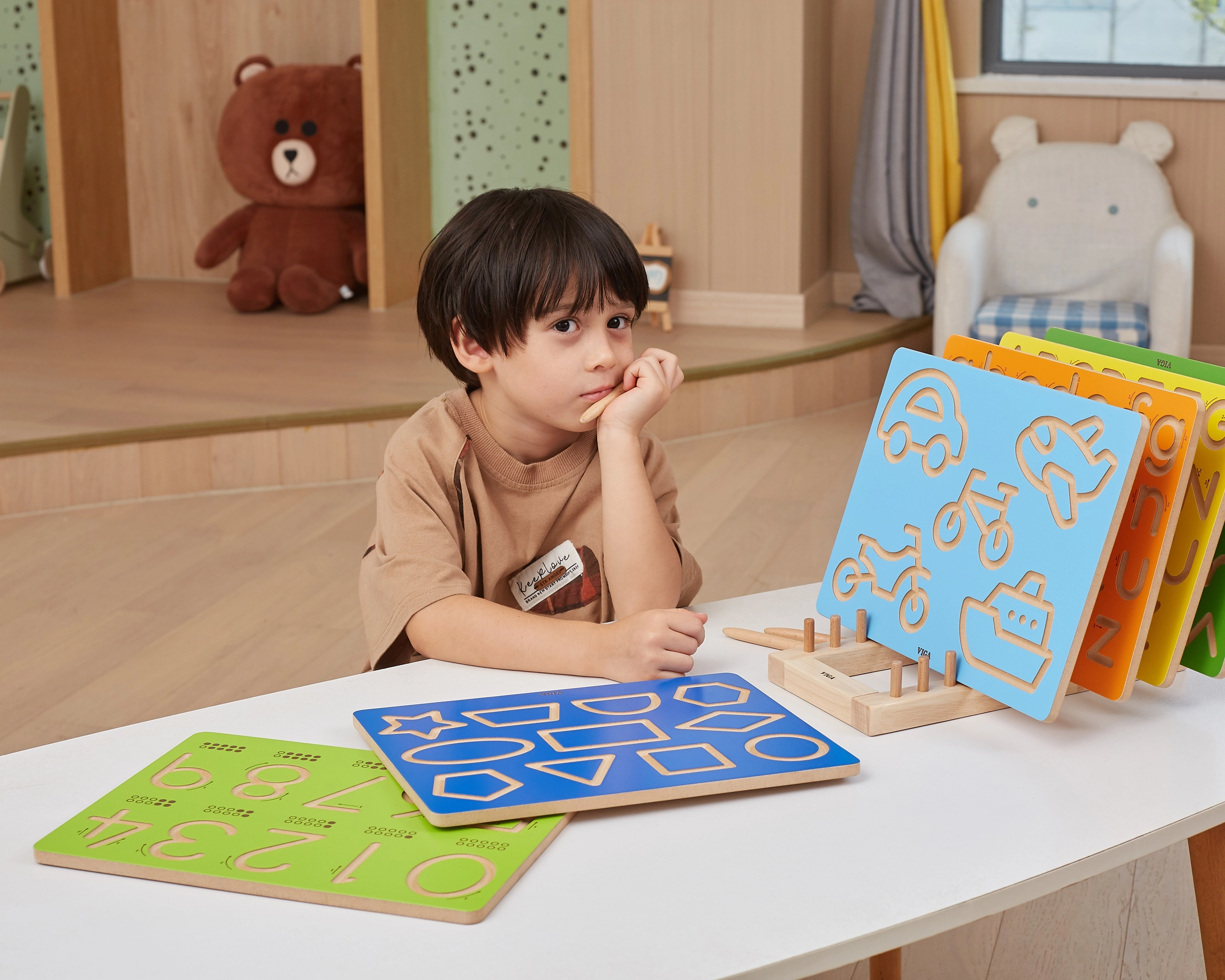 - Praktiškas atlikimas: medinė lentelė ir medinis „rašiklis“ saugiam ir pakartotiniam treniravimuisi.