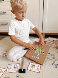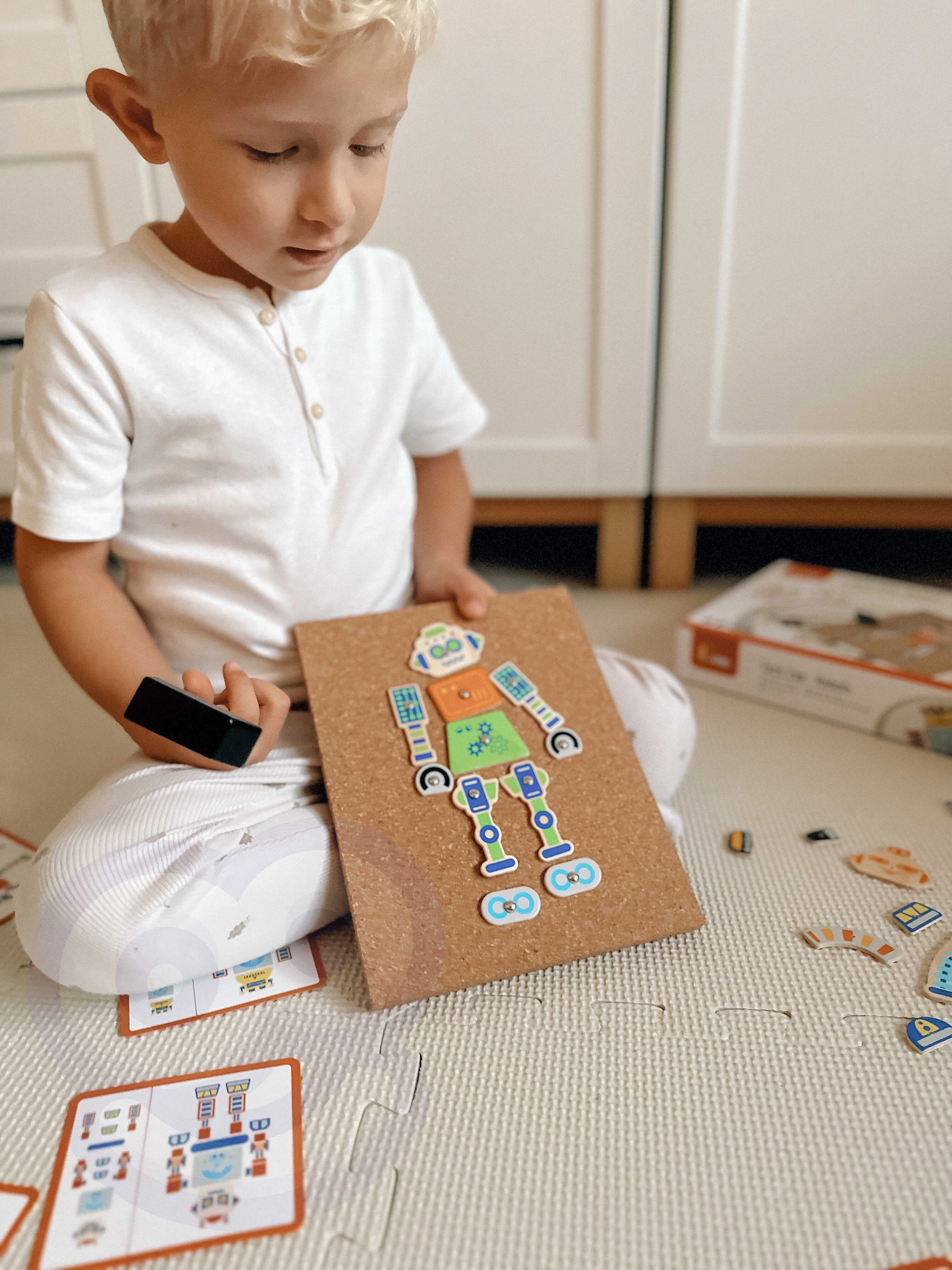 10 šablonų kortelių padeda lengvai pradėti, tačiau tikras smagumas prasideda kuriant laisvai. Vaikai susikurs savo robotus ir lavins vaizduotę bei planavimą.