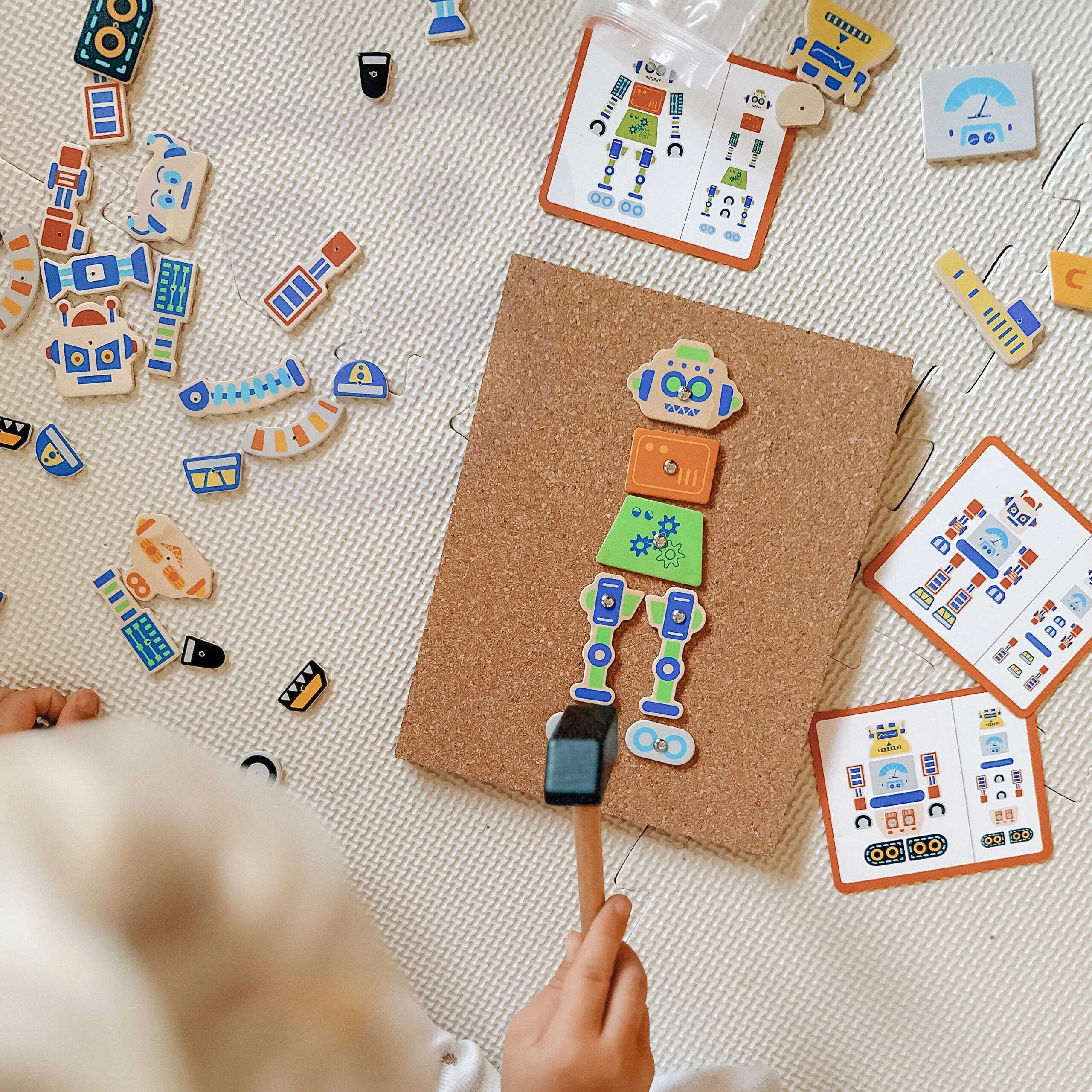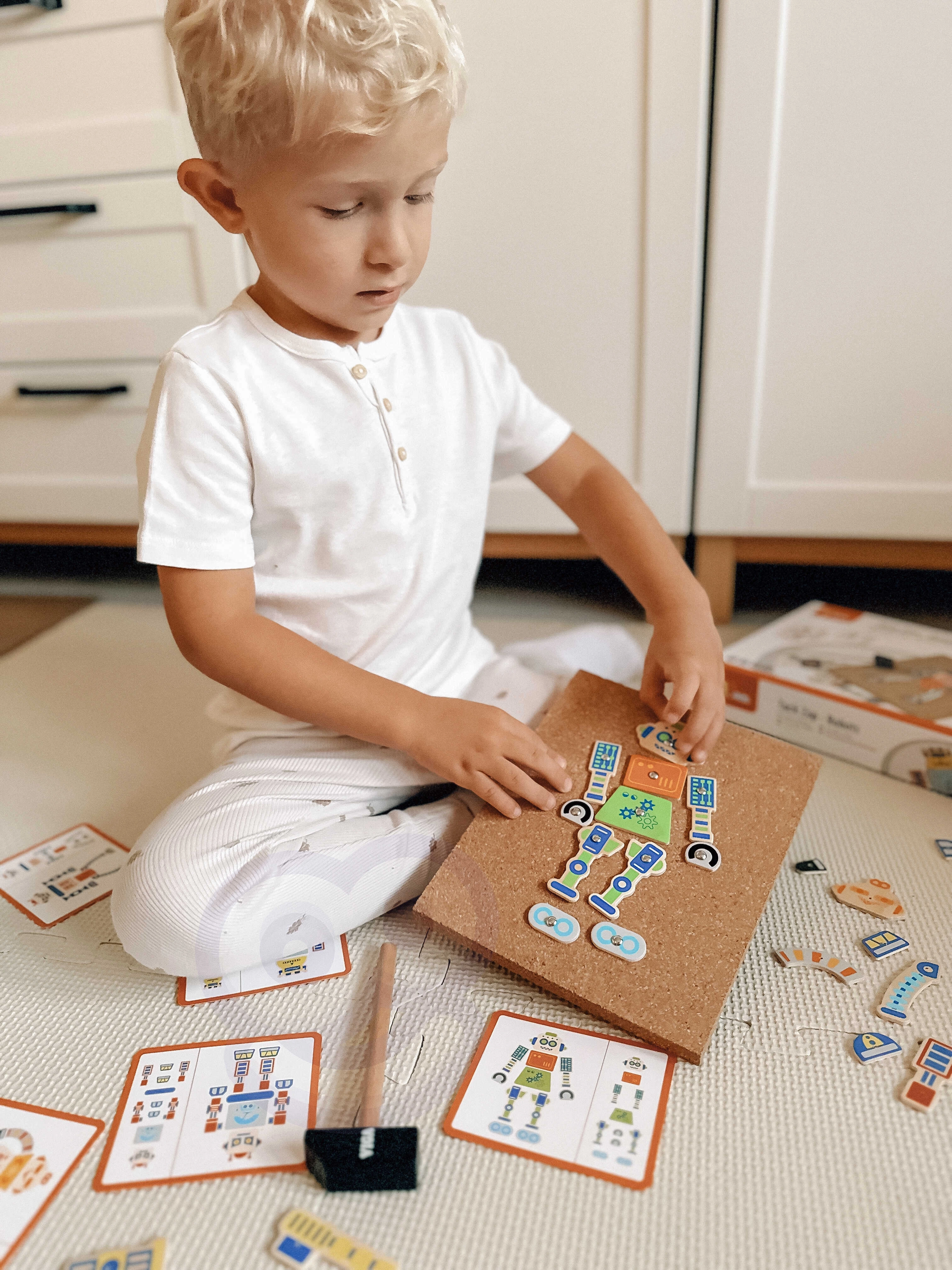 Pridėtos instrukcinės kortelės su 10 robotų pavyzdžių padeda atpažinti formas, gerina akies–rankos koordinaciją ir kantrybę. Vaikai gali kurti pagal šablonus arba visiškai laisvai – tai skatina kūrybinį mąstymą ir savarankiškumą.