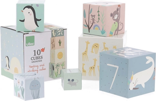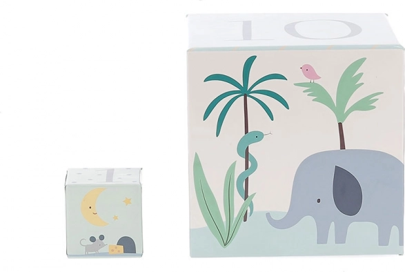 Šis pirmasis dėžučių rinkinys prisitaiko prie vaiko augimo tempo: nuo paprasto manipuliavimo iki bokšto statymo ir skaičių 1–10 mokymosi. Kiekvieną dėžutę puošia švelnios viso pasaulio gyvūnų iliustracijos ir ryškios skaitmenos, kurios natūraliai skatina pažinimą ir įvardijimą.