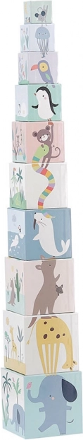 Atraskite linksmą edukacinį žaislą patiems mažiausiems: 10 tvirtų kartoninių dėžučių su gyvūnų iliustracijomis ir skaičiais 1–10, sukurta dizainerės Sarah Betz. Vaikai nuo 2 metų žaisdami lavina skaičiavimą, spalvų ir gyvūnų atpažinimą bei akių–rankų koordinaciją. Lengvą, bet patvarią ekologiško kartono rinkinio dėžučių seriją paprasta statyti į aukštą bokštą ir sudėti vieną į kitą taupiam laikymui.