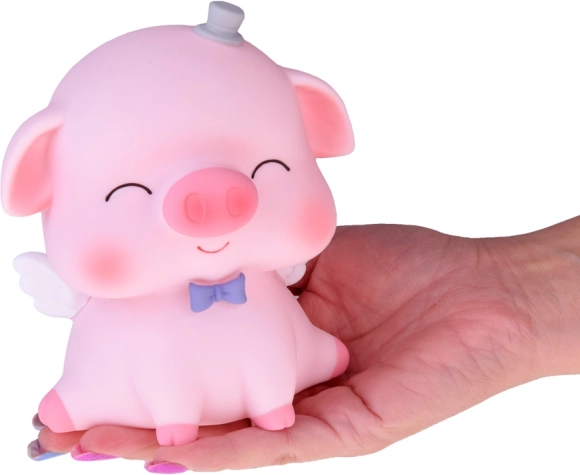 Rožinis paršeliukas su baltais sparneliais, mėlynu varlytės kaklaraiščiu ir geltona karūna pradžiugins akį ir kartu taps stilinga vaikų kambario ar darbo stalo dekoracija.