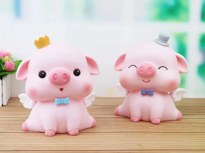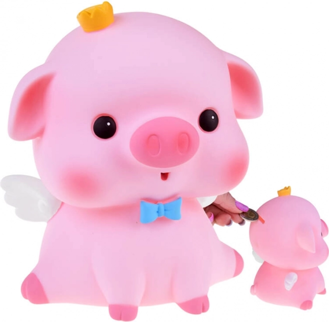 Ši žavi taupyklė rožinio paršeliuko formos su baltais sparneliais, mėlynu varlytės kaklaraiščiu ir geltona karūna sujungia praktiškumą ir džiaugsmą. Ji leidžia laikyti visas įprastas monetas ir sulankstytus banknotus ir kartu jaukiai papuošia interjerą. Idealu vaikams, kurie mokosi pinigų vertės, ir suaugusiesiems, norintiems patogiai laikyti smulkias santaupas vienoje vietoje.