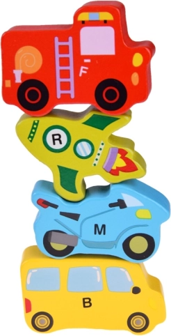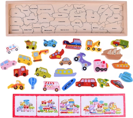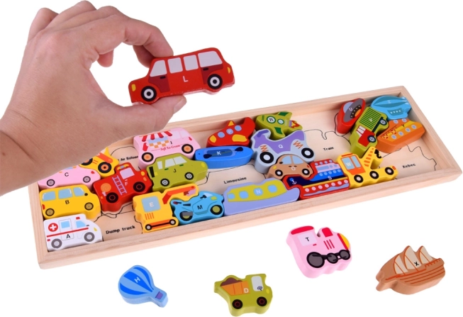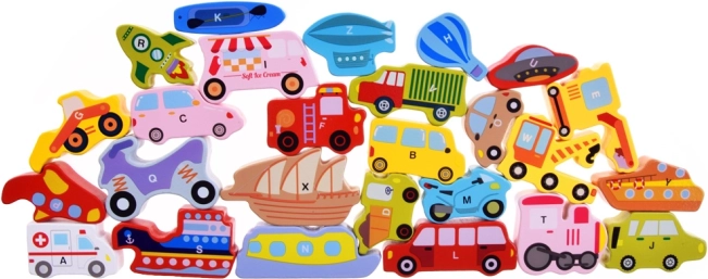 Šiame mediniame rinkinyje yra 27 spalvingos transporto priemonės – nuo automobilio, autobuso ir gaisrinės iki baliono, laivo, raketos ar dirižablio – ir medinis pagrindas su pažymėtais pavadinimais. Kiekviena dalis pažymėta raide A–Z (įskaitant specialų motyvą), todėl vaikai linksmai mokosi abėcėlės ir plečia žodyną.
