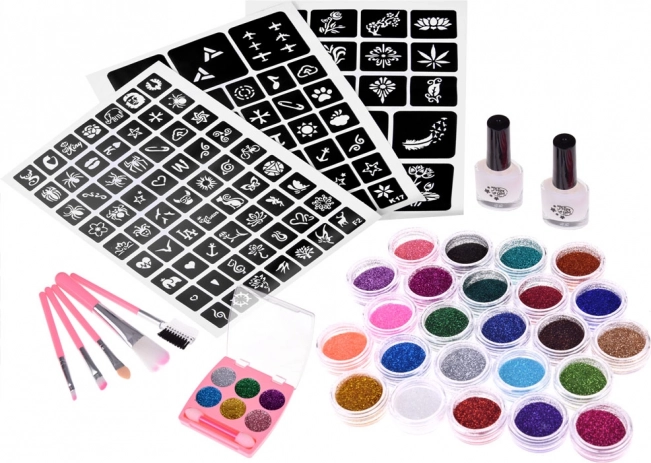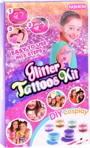 Su šiuo blizgančių tatuiruočių rinkiniu akimirksniu sukursite nuostabias blizgančias tatuiruotes. Jame yra 120 trafaretų įvairių dydžių, 24 indeliai su gražiais blizgučiais ir 2 buteliukai klijų – pakanka daugybei tatuiruočių. Taip pat pridedami blizgantys akių šešėliai ir teptukų rinkinys nepriekaištingam stiliui.