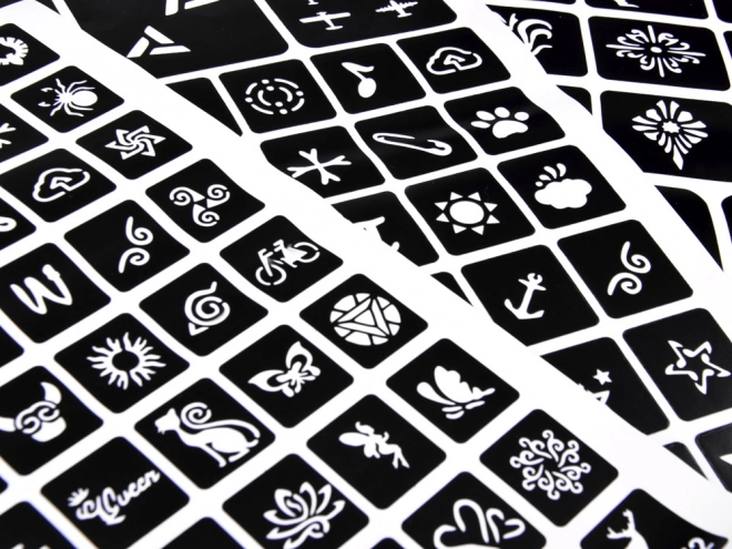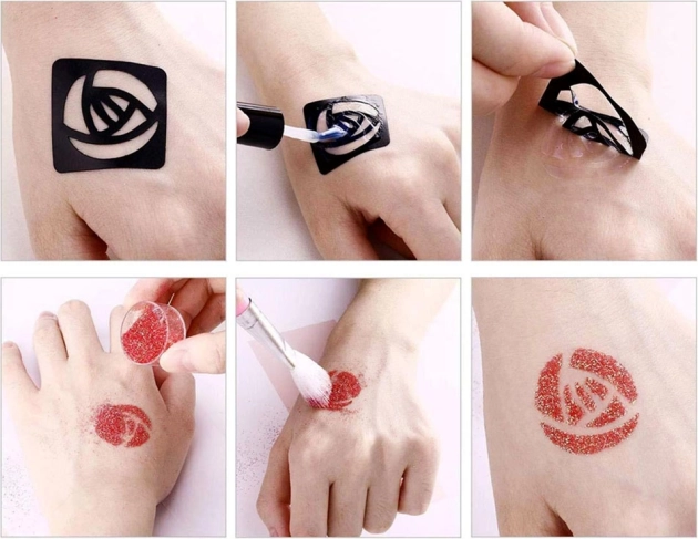 Instrukcija: Pasirinkite trafaretą ir priklijuokite jį ant švarios odos, užtepkite raštą klijais, nuplėškite trafaretą, užbarstykite blizgučių spalvas – ir viskas!