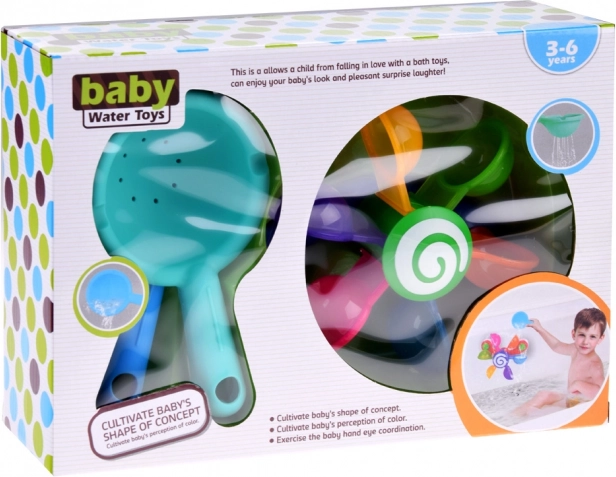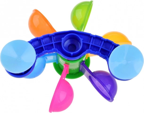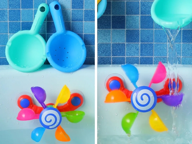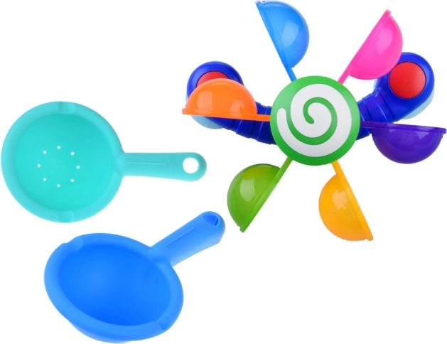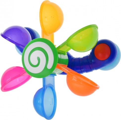 Leiskite savo vaikui mėgautis žaidimu su spalvingais judančiais kaušeliais, kurie sukasi, kai ant jų pilamas vanduo – taip vaikas mokosi judesio ir priežasties–pasekmės ryšio. Šis žaislas skatina motorinį vystymąsi, kognityvines funkcijas ir koordinaciją. Žaidimo metu vaikas gali mokytis spalvų, skaičiavimo ir kurti įvairias istorijas. Maudynių žaislą lengva perkelti ir išardyti, todėl jį galima tvirtinti prie vonios, dušo ar baseino kraštų. Spalvota kaušelių vaivorykštė ima suktis, kai liejasi vanduo, ir kartu stimuliuoja vaiko klausą.
