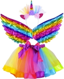 Atraskite magiją su šiuo nuostabiu vienaragio kostiumu, leidžiančiu kiekvienam vaikui žengti į stebuklų pasaulį. Rinkinyje yra gražus vaivorykštinių spalvų sijonėlis, spindesiu žavintys sparnai ir unikalus lankelis su vienaragio ragu.