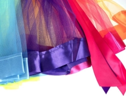 Pagrindinis akcentas – vaivorykštės spalvų įkvėpta sijonėlė iš daugiiasluoksčio tiulio, užbaigta satino juostele.