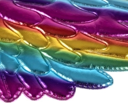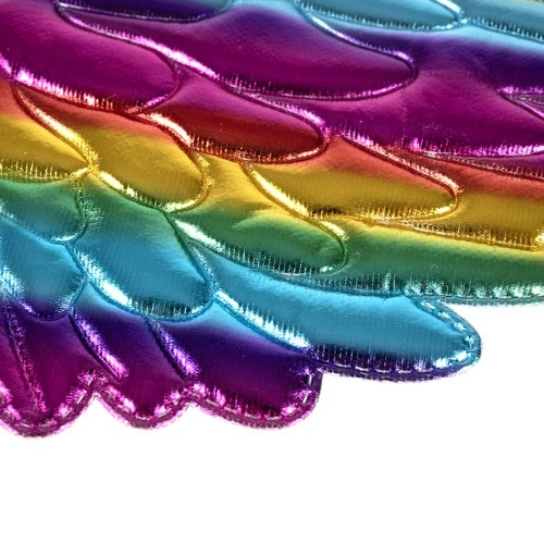Blyksniuojančio paviršiaus medžiagos sparnai su daugiaspalviais elementais kuria nuostabų magišką efektą.