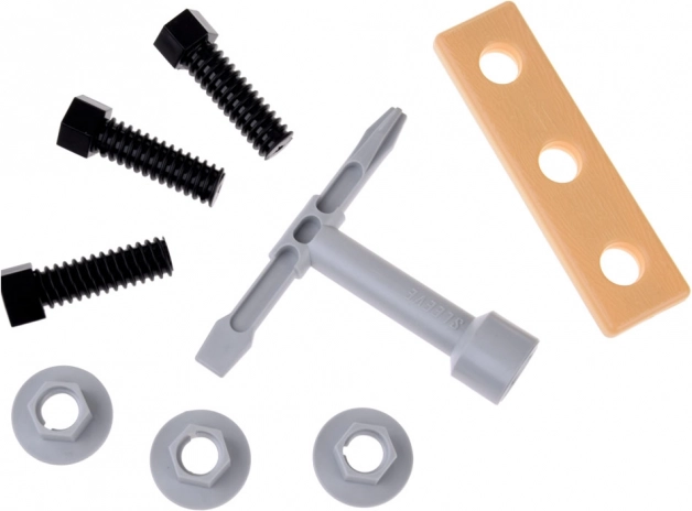 Kiekvienam mažajam meistrui, norinčiam išbandyti savo taisymo įgūdžius, šis didelis įrankių rinkinys – puikus pasirinkimas. Rinkinį sudaro plastikiniai įrankiai trijų spalvų deriniuose: juoda, oranžinė ir pilka, o jų realistinės formos skatina kūrybišką ir vaizduotę lavinantį žaidimą. Kasdieniai taisymai taps pramoga – nesvarbu, ar tai žaislinės mašinėlės rato pritvirtinimas, ar lėlių namelio varžtelio priveržimas.
