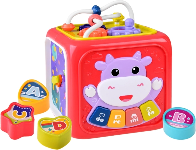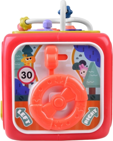 Šis daugiafunkcis edukacinis kubas sukurtas taip, kad augtų kartu su jūsų vaiku. Kiekvienoje pusėje laukia kita veikla: šviečiantis pianinas su dainelėmis ir gyvūnų garsais, mechaniniai elementai pirštukams, vairas mažiesiems vairuotojams, laikrodis laiko mokymuisi ir rūšiuoklė formoms bei spalvoms atskirti. Dėl kompaktiškų matmenų puikiai tinka pasivaikščiojimams ir kelionėms.
