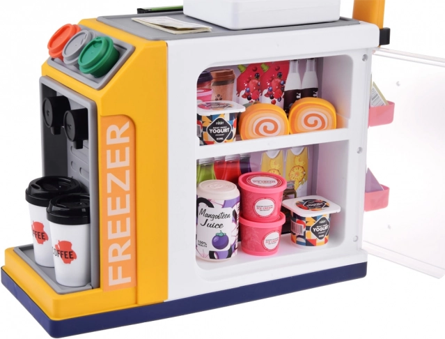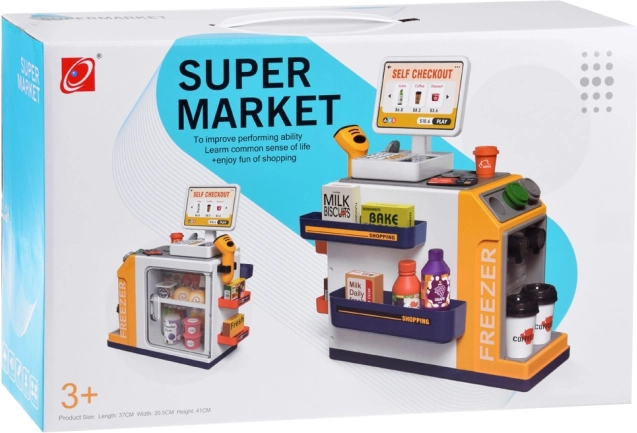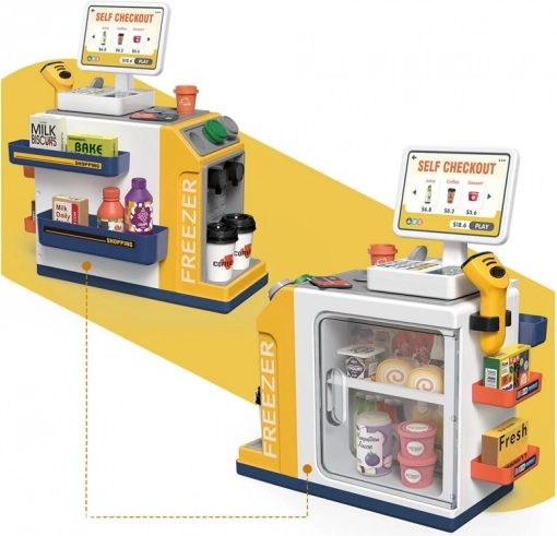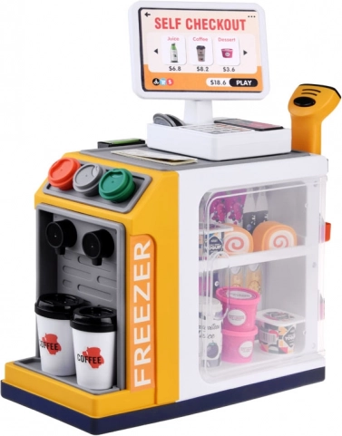 Ši realistiška savitarnos kasa su kavos kampeliu pavers kambarį mažu prekybos centru. Vaikai išbandys klientų aptarnavimą, kavos ruošimą, prekių skenavimą ir atsiskaitymą kortele ar „grynaisiais“. Integruotas šaldiklis/šaldytuvas desertams ir gėrimams, spalvoti mygtukai ir ekranas sukuria autentišką įspūdį.