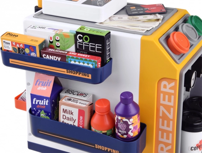 Kavos ir espreso puodeliai, banknotai, monetos, kreditinė kortelė, įvairūs gėrimai ir dėžutės su „prekėmis“ – viskas kūrybiškam vaidmenų žaidimui ir vaizduotei lavinti.