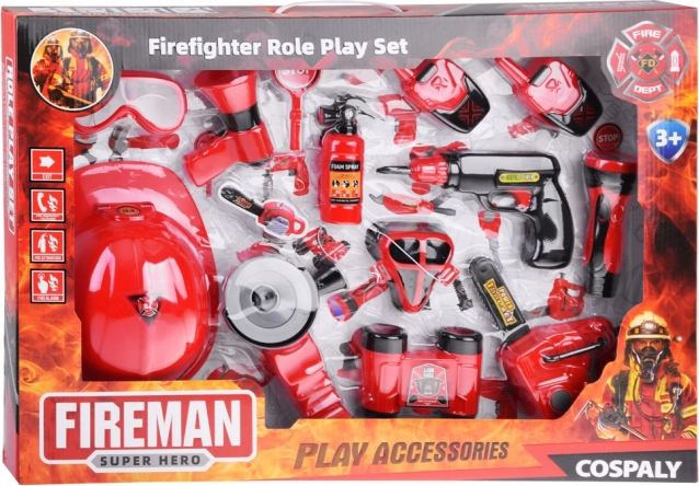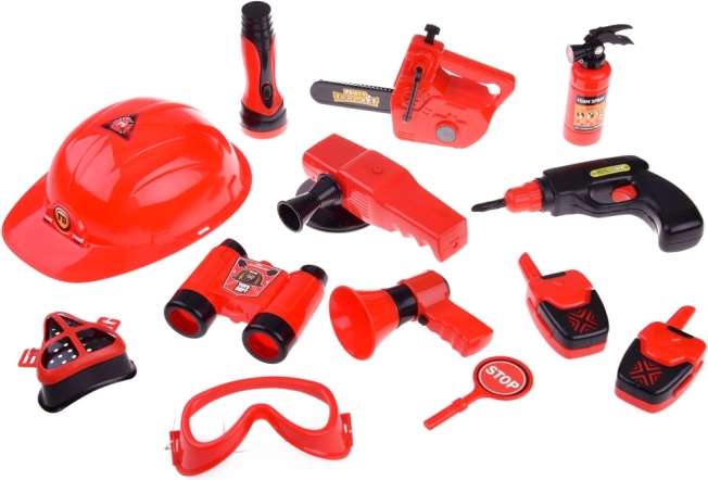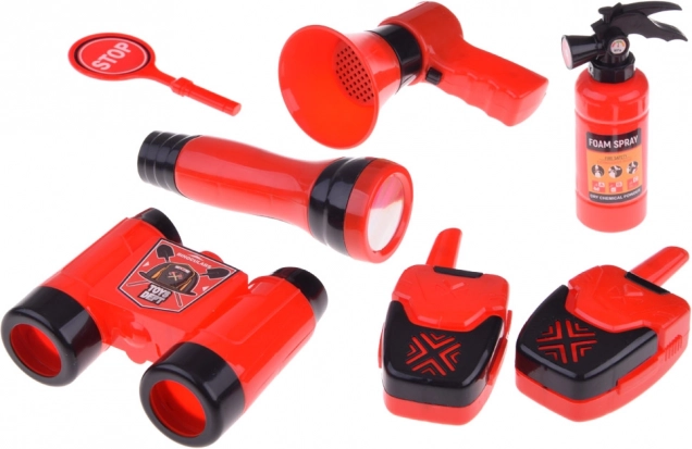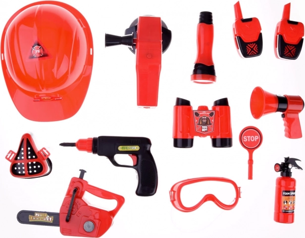 Rinkinyje yra viskas, ko reikia gaisrininko žaidimui: šalmą, žiūronai, megafonas, kaukė ir kiti saugos priedai.