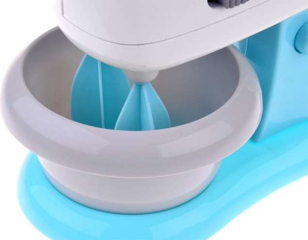 Žaislas atkartoja tikrą virtuvinį maišytuvą su besisukančiais plaktuvėliais ir mėlyna šviesos efekto indikacija.