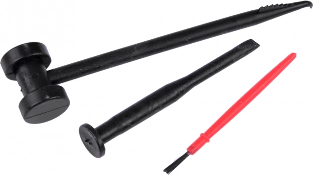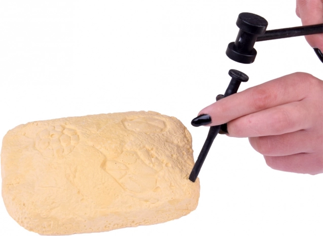 Į pakuotę įeina plastikinis plaktukas, kaltelis ir teptukas – puikiai tinka kruopštiems kasinėjimams ir rastų lobinių valymui.