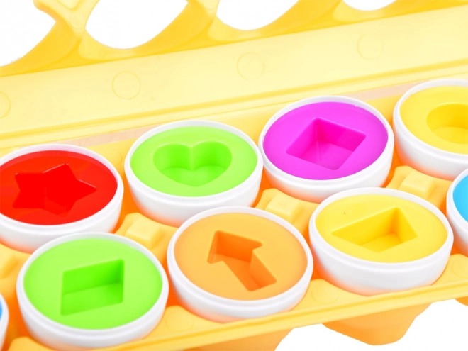 Ši išmani rinkinio sudėtis – 12 baltų kiaušinių geltoname plastikiniame dėkle. Viduje vaikai ras skirtingų spalvų puseles su formomis, kurias reikia teisingai suporuoti pagal spalvą ir formą (pvz., žvaigždė, širdis, ratas, kvadratas ir kt.). Žaidimas skatina ankstyvą įgūdžių raidą, moko kantrybės ir susikaupimo.