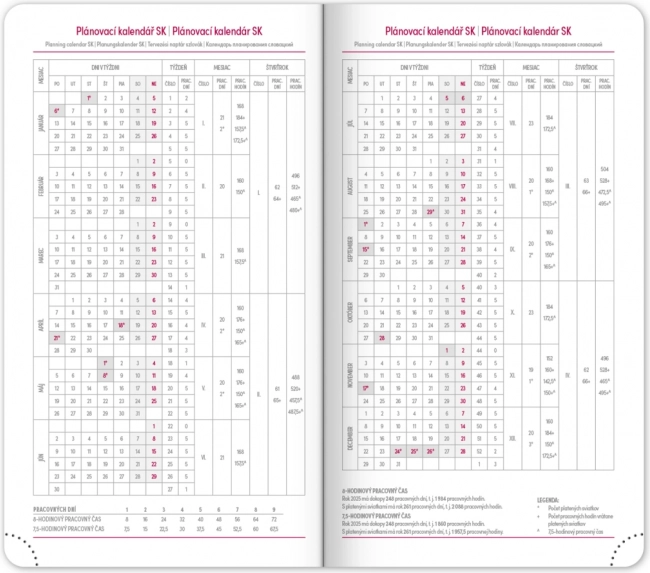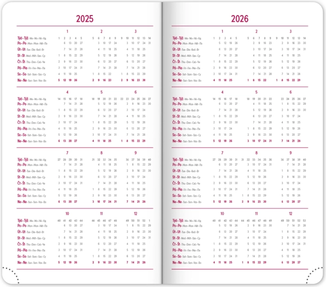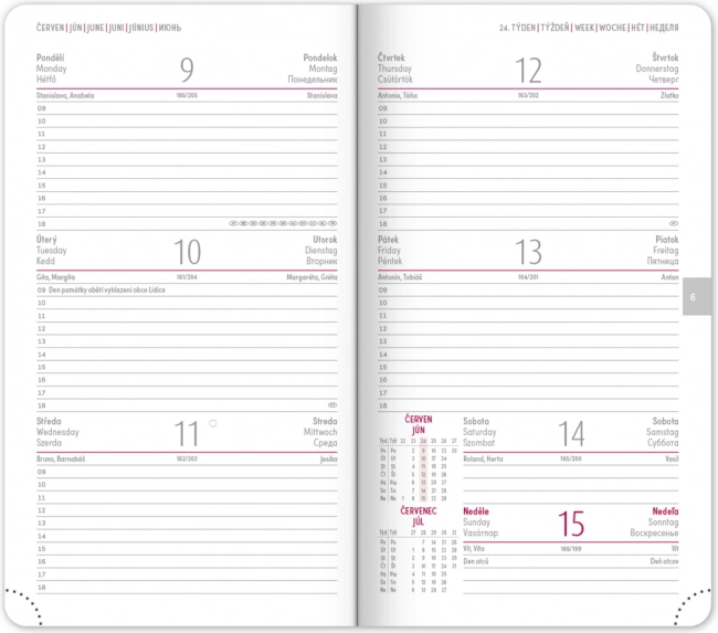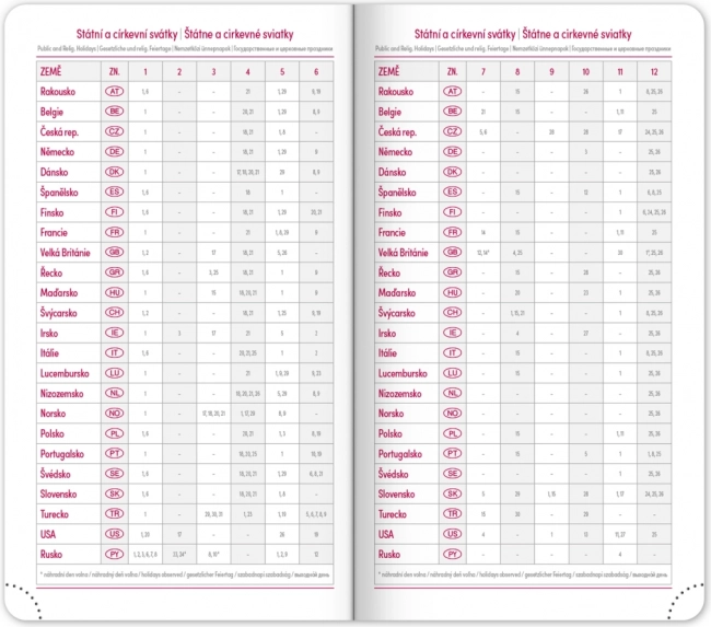 Dienoraštis pateikia aiškų savaitinį išdėstymą su čekišku–slovakišku kalendoriumi ir papildoma anglų, vokiečių, vengrų bei rusų kalba. Taip pat rasite mėnesinius ir metinius planavimo kalendorius, švenčių sąrašą, išplėstinį čekų vardų sąrašą ir žemėlapius. Suapvalinti kampai, tekstilinė juostelė ir perforuoti kampeliai palengvina kasdienį naudojimą, o metų skaičiaus ir logotipo įspaudimo galimybė pradžiugins įmones ir reiklius naudotojus.