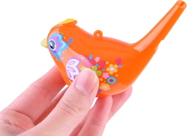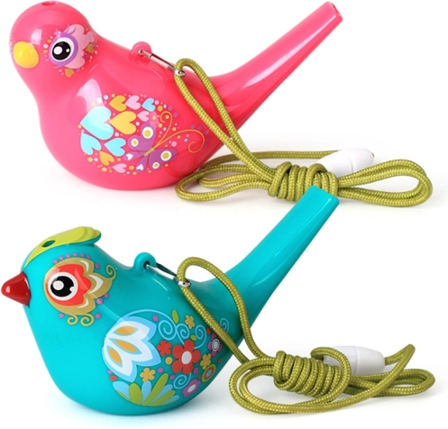 Šis vandens švilpukas paukštelio formos yra lengvas, patvarus ir idealiai tinka vaikams. Be vandens skleidžia švarų, ryškų toną; įpylus šiek tiek vandens paukštelis pradeda melodingai čiulbėti. Garsumą ir tono aukštį lengvai valdysite vandens kiekiu ir pūstelėjimo stiprumu.
