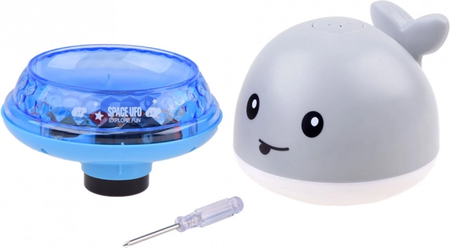 Už vandens ribų pasodinkite banginį ant platformos, perjunkite on/off ir stebėkite, kaip jis važiuoja pagal linksmos muzikos ritmą su šviesos efektais.