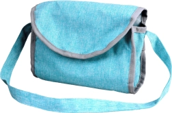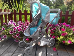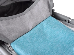 Reguliuojama minkšta rankena, saugos diržai, sulankstomas stogelis ir erdvus krepšys papildomi nuimamu aksesuarų krepšeliu.