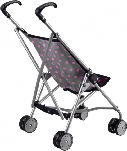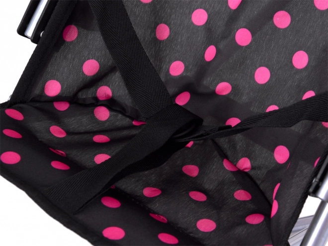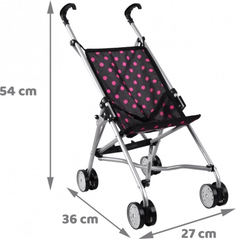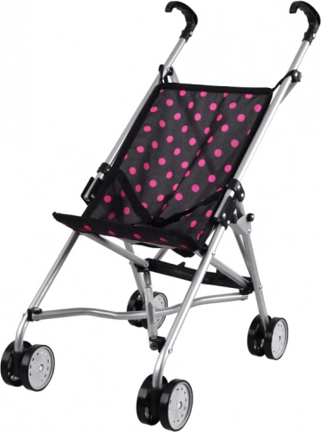Modernaus dizaino tekstilinė sėdynė juodos spalvos su rožiniais taškeliais yra patvari ir maloni liesti. Dvigubi ratukai garantuoja sklandų riedėjimą ir gerą valdymą ant įvairių paviršių. Saugūs sulankstymo/išskleidimo elementai ir dirželiai sėdynėje padeda išlaikyti lėlę vietoje.