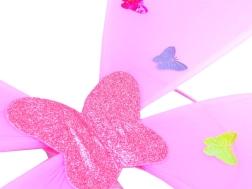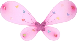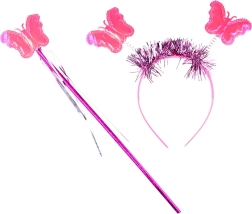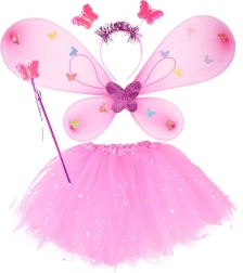 Ryškiai rožiniai sparnai su spalvingais drugeliais, deranti lazdelė ir lankelis – viskas vieningo fėjiško stiliaus.