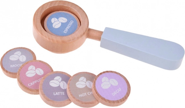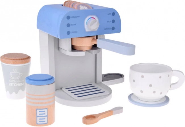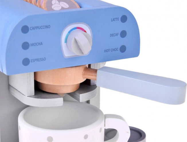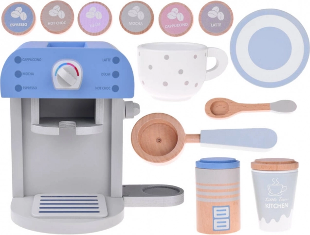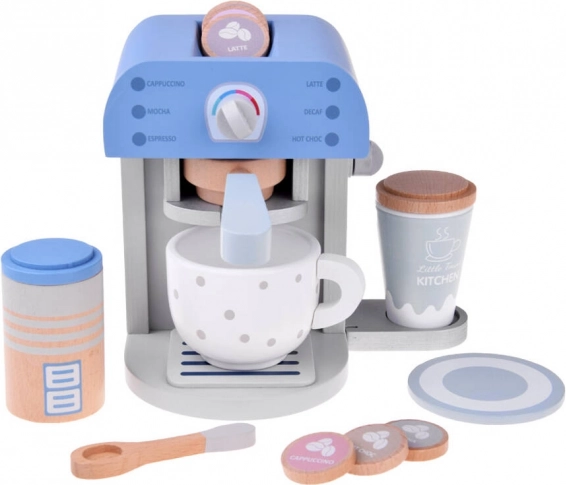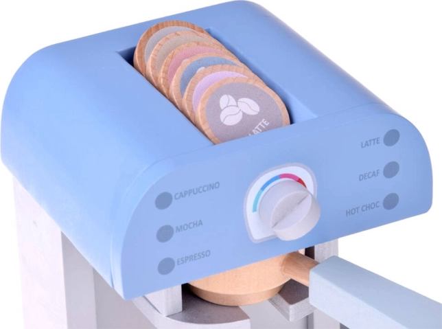 Medinis vaikų kavos aparatas elegantiškos mėlynos spalvos – puikus žaislas kiekvienai vaikų virtuvei. Šis stilingas ir kokybiškai pagamintas rinkinys apima kavos aparatą ir priedus, kurie užtikrina smagų ir ugdomąjį žaidimą.