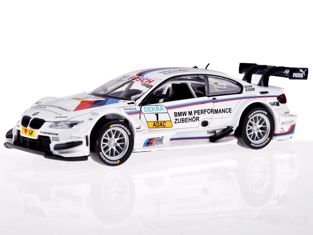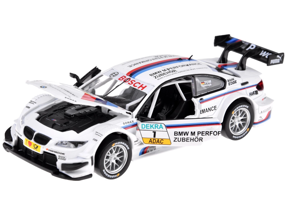 Stilingas metalinis BMW M3 DTM modelis 1:32 masteliu pradžiugins tiek vaikus, tiek kolekcionierius. Jis turi metalinius kėbulo elementus, atsidarančias dureles, įspūdingus garso ir šviesos efektus bei spyruoklinį užvedimą (friction power) greitam važiavimui. Rinkinyje yra 3× LR44 baterijos.