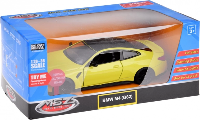Kolekcinis metalinis modelis BMW M4 masteliu 1:32 pradžiugins ir vaikus, ir suaugusiuosius. Jis turi atsidarančias dureles, realistinius šviesos efektus (priekiniai, galiniai žibintai ir apšviestas prietaisų skydelis) bei variklio, signalo ir aliarmo garsus. Dėl frikcinės pavaros pakanka modelį patraukti per lygų paviršių, ir jis nuvažiuos į priekį.