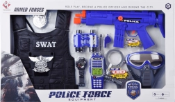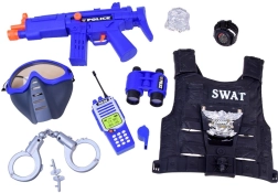 Vaikiškas policijos rinkinys mažiesiems herojams suteikia viską, ko reikia tikroviškam teisėsaugininko vaidmeniui: plastikinę SWAT liemenę, policinį pistoletą/šautuvą, raciją, žiūronus, antrankius, ženklelį, apsauginius akinius/kaukę, laikrodį ir švilpuką. Lengva ir saugi medžiaga, paprastas užsegimas ir gausi komplektacija – fantastiškam policininko vaidmeniui namuose ir karnavale.