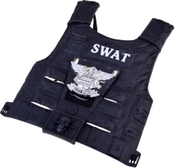 Lengva plastikinė liemenė su ryškiu užrašu SWAT suteikia žaidimui tikrą policijos įvaizdį. Lengva apsivilkti dėl elastingo užsegimo nugaroje.
