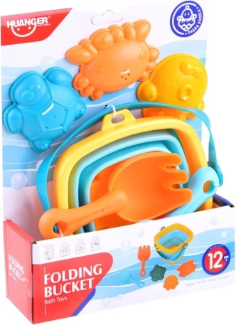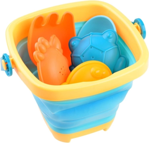 Jame yra viskas, ko vaikams reikia kūrybiškam žaidimui smėlyje: sulankstomas kibirėlis, kastuvėlis, grėbliukas ir trys formelės.