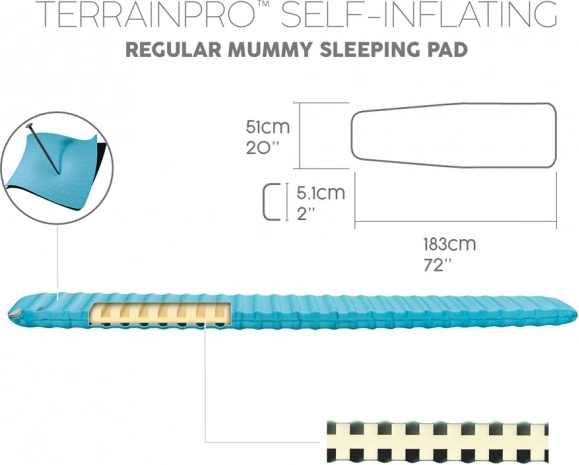 5,1 cm storis ir R 4,7 vertė sulaiko šilumą ir suteikia stabilią atramą net nelygiame pagrinde. Idealu patogiai miegoti stovyklaujant vėsesniu oru.
