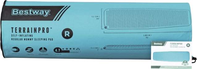 Ieškote patikimo kilimėlio stovyklavimui ir žygiams? BESTWAY TerrainPro – tai savaime prisipučiantis kilimėlis, kuris derina aukštą R 4,7 izoliaciją, patogų 5,1 cm storį ir patvarią konstrukciją iš ToughLite ir 70D ripstop nailono. Jis suteikia stabilią kūno atramą, puikiai izoliuoja nuo žemės ir tinka naudoti su įprastais mumių tipo miegmaišiais.