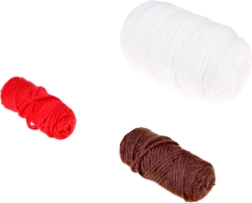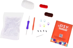 - 3 medvilniniai siūlai (ekri, ruda, raudona), užpildas, 2,5 mm nėrlapis, dvipusis nėrlapis, saugos adata, saugios akys, 5 saugos segtukai/žymekliai, iliustruota instrukcija su QR kodu į vaizdo įrašą