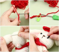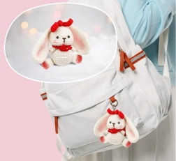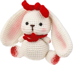 Sukurkite minkštą zuikutį iš baltų, raudonų ir rudų siūlų – puiki dovana ir puošmena vaikų kambariui.