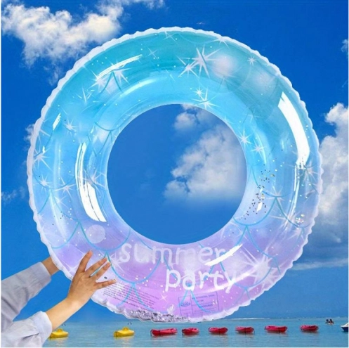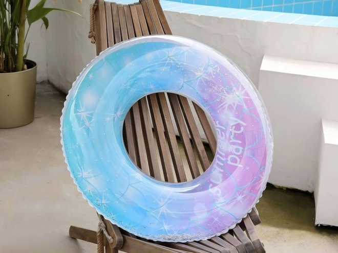 Permatomas ratas su mėlynos–rožinės spalvos gradientu ir „summer party“ blizgučiais sužibės prie baseino ir paplūdimyje bei pradžiugins kiekvieną vaiką.