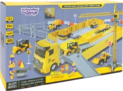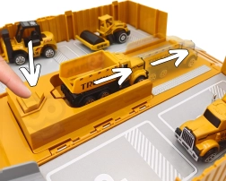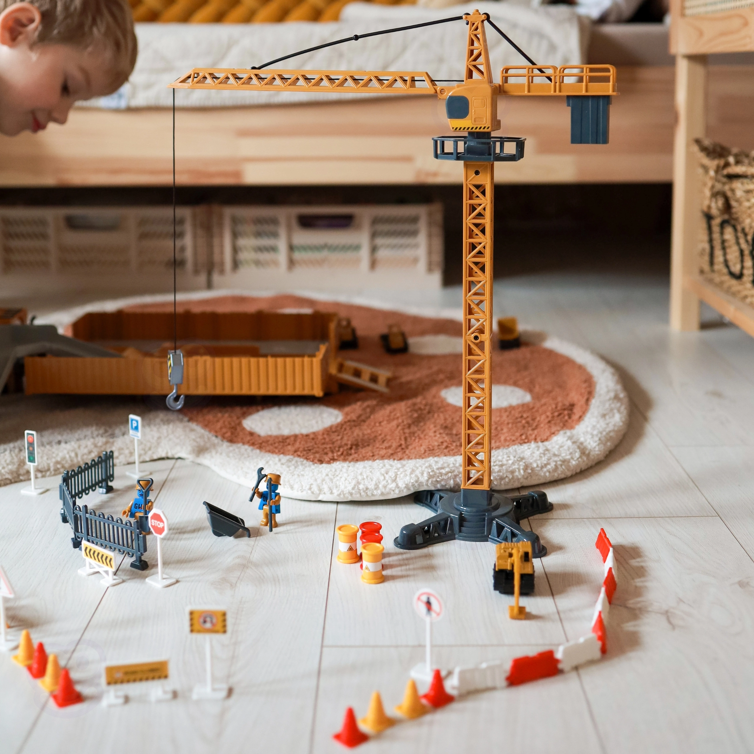 Komplekte yra bokštinis kranas su pasukimu, virve ir kabliu, galinčiu kelti priedus, taip pat 6 judantys statybiniai mechanizmai (pvz., ekskavatorius, betono maišyklė, savivartis). Darbininkų figūrėlės turi griebiamas rankas įrankiams. Vilkike yra 4 interaktyvūs mygtukai su signalu, atbulinės eigos garsu ir melodijomis, kurias papildo mirksinčios raudonos šviesos.