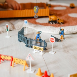 Saugiam ir edukaciniam žaidimui pridedamos kelio ženklai, užtvarai, kūgiai ir tvorelės, kad vaikai susipažintų su kelių ir statybų saugumo pagrindais. Rinkinys puikiai tinka kūrybiškam žaidimui, smulkiosios motorikos ir vaizduotės lavinimui.